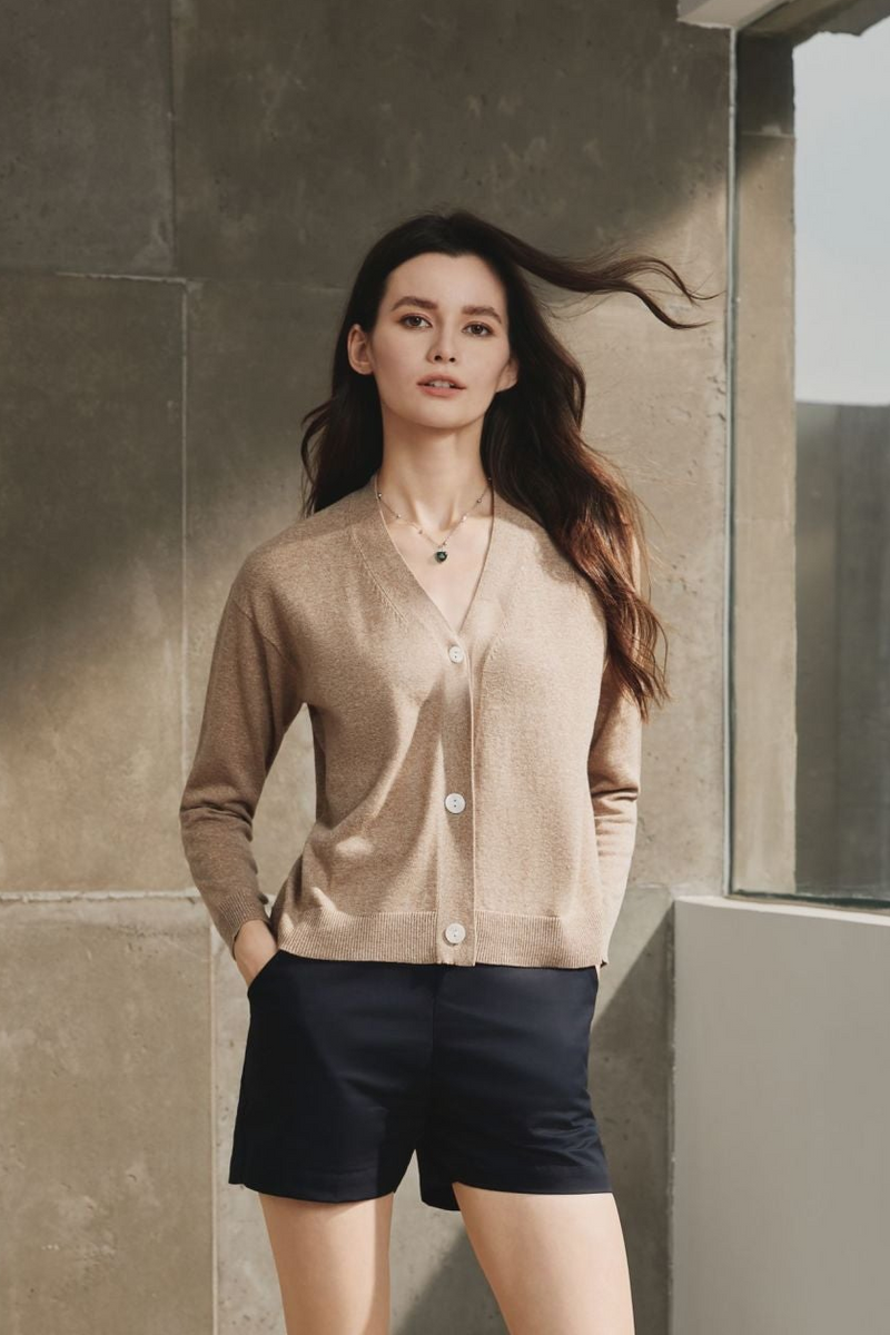 Cotton V-Neck Cardigan, Taupe -